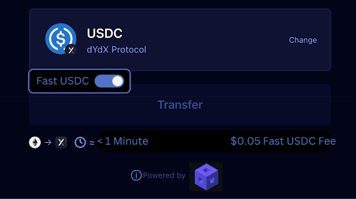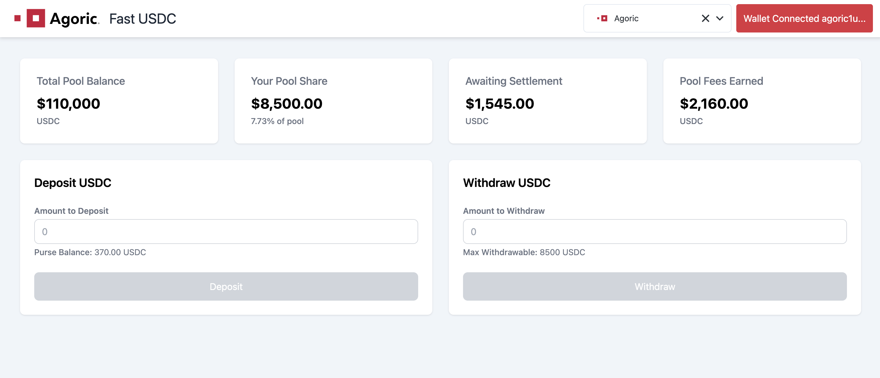 Fast USDC, powered by Agoric Orchestration, and now live on Agoric mainnet, cuts wait times to under 1 minute! Here’s a mockup showing what it would look like in an application – all from a simple toggle.